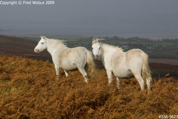 White horses on the Gower Peninsula near Penmaen, South Wales, UK