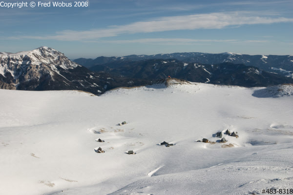 View of Michelbauer Hut, Schneealpe Hut and Heukuppe summit from the Windberg (1903m), Lower Austria